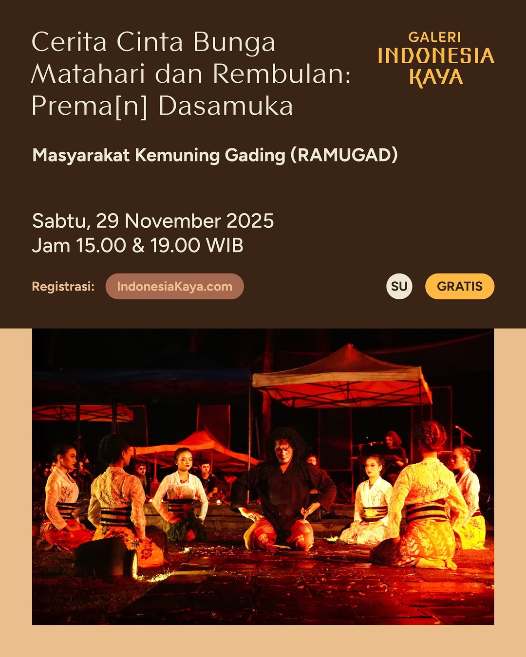 Cerita Cinta Bunga Matahari dan Rembulan: Prema[n] Dasamuka oleh Masyarakat Kemuning Gading (RAMUGAD) Tanggal 29 November 2025 Pukul 15.00 & 19.00 WIB Rating: Semua Umur Di Galeri Indonesia Kaya Reservasi: IndonesiaKaya.com Dibuka hari SENIN - Reservasi sesi 15.00 dibuka pukul 9.00 WIB - Reservasi sesi 19.00 dibuka pukul 15.00 WIB GRATIS! Pertunjukan ini menampilkan kisah cinta Rahwana kepada Shinta melalui perpaduan tari modern dan musik tradisional Sunda yang digabungkan dengan musik modern, membimbing penonton melalui alur yang disampaikan lewat gerak dan bunyi. Bunga matahari merah melambangkan Rahwana yang membara, penuh gairah, namun rapuh oleh rindu. Rembulan menggambarkan Shinta yang lembut, tenang, tapi jauh dan tak tergapai. Pertunjukan berakhir dengan cahaya meredup, menandakan cinta yang abadi meski tak berlabuh. #IndonesiaKaya #PertunjukanIndonesiaKaya #GaleriIndonesiaKaya