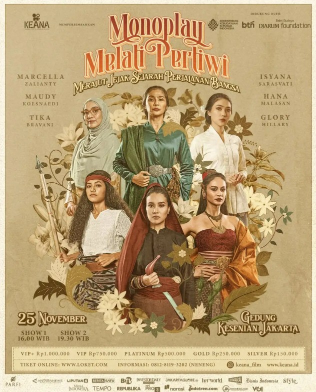 Keana Film didukung oleh Bakti Budaya Djarum Foundation mempersembahkan Monoplay Melati Pertiwi Merajut Jejak Sejarah Perjalanan Bangsa Sebuah pementasan yang menghadirkan kembali semangat enam perempuan pejuang melalui interpretasi para pemeran: Isyana Sarasvati, Marcella Zalianty, Maudy Koesnaedi, Tika Bravani, Hana Malasan, dan Glory. Kisah-kisah mereka dirangkai dalam satu panggung sebagai persembahan untuk 80 Tahun Kemerdekaan Indonesia dan penghormatan di Bulan Pahlawan. Dipandu oleh sentuhan sutradara Wawan Sofwan dan diproduseri oleh Marcella Zalianty, pementasan ini dihadirkan untuk menggugah kembali energi perjuangan yang pernah membentuk bangsa ini. ️ 25 November 2025 Gedung Kesenian Jakarta Tiket tersedia melalui link di bio instagram @keana_film. Info selengkapnya: 0812-8119-3202 (Neneng)