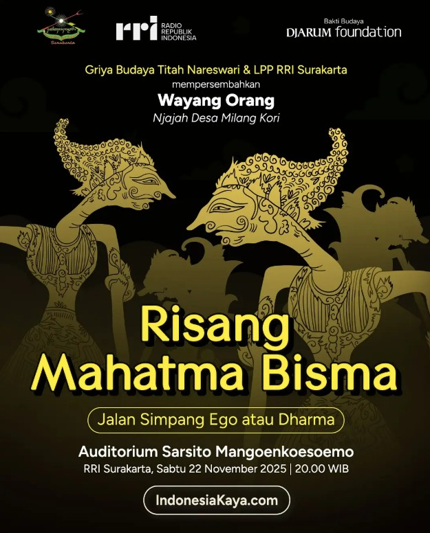 Bakti Budaya Djarum Foundation dengan RRI Surakarta mempersembahkan Njajah Desa Milang Kori “Risang Mahatma Bisma” Bisma, sang Dewabrata, membuat keputusan fenomenal yang mengguncang hati banyak orang. Ia memilih melepaskan hak atas tahta dan berjanji untuk tidak menikah, sebuah pengorbanan besar demi tujuan mulia yang ia yakini. Namun, apakah pengorbanan ini cukup untuk mewujudkan harapan yang ia perjuangkan? Ataukah keputusan tersebut justru memicu rangkaian peristiwa penuh dinamika yang berujung pada konflik tak terkendali? Sabtu, 22 November 2025 Pukul 20.00 WIB Di Auditorium Sarsito Mangoenkoesoemo, RRI Surakarta Livestream: YouTube Ali Marsudi Arjuna YouTube RRI Surakarta Pro 4 RRI Surakarta FM 95,2 Mhz, Aplikasi RRI Digital